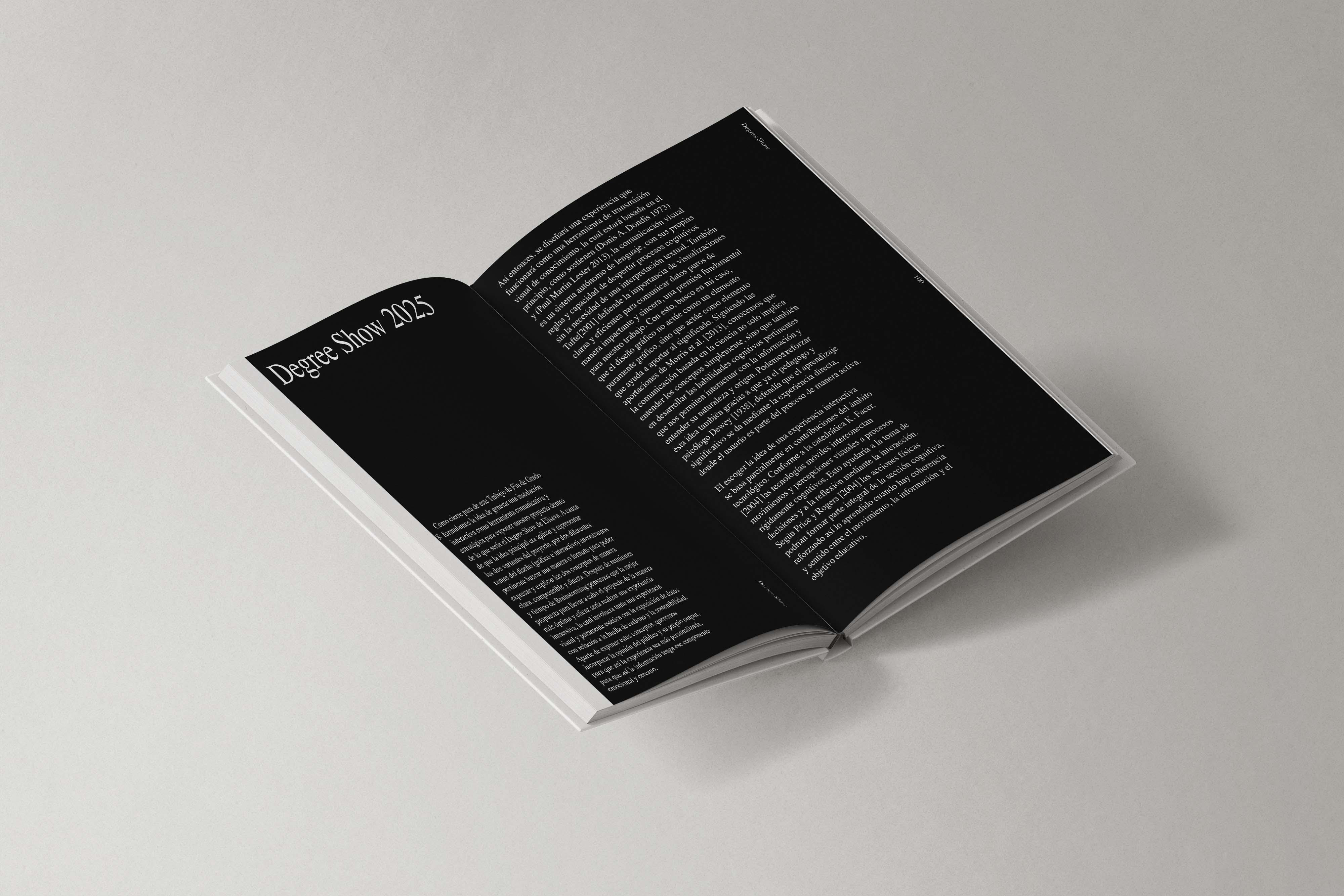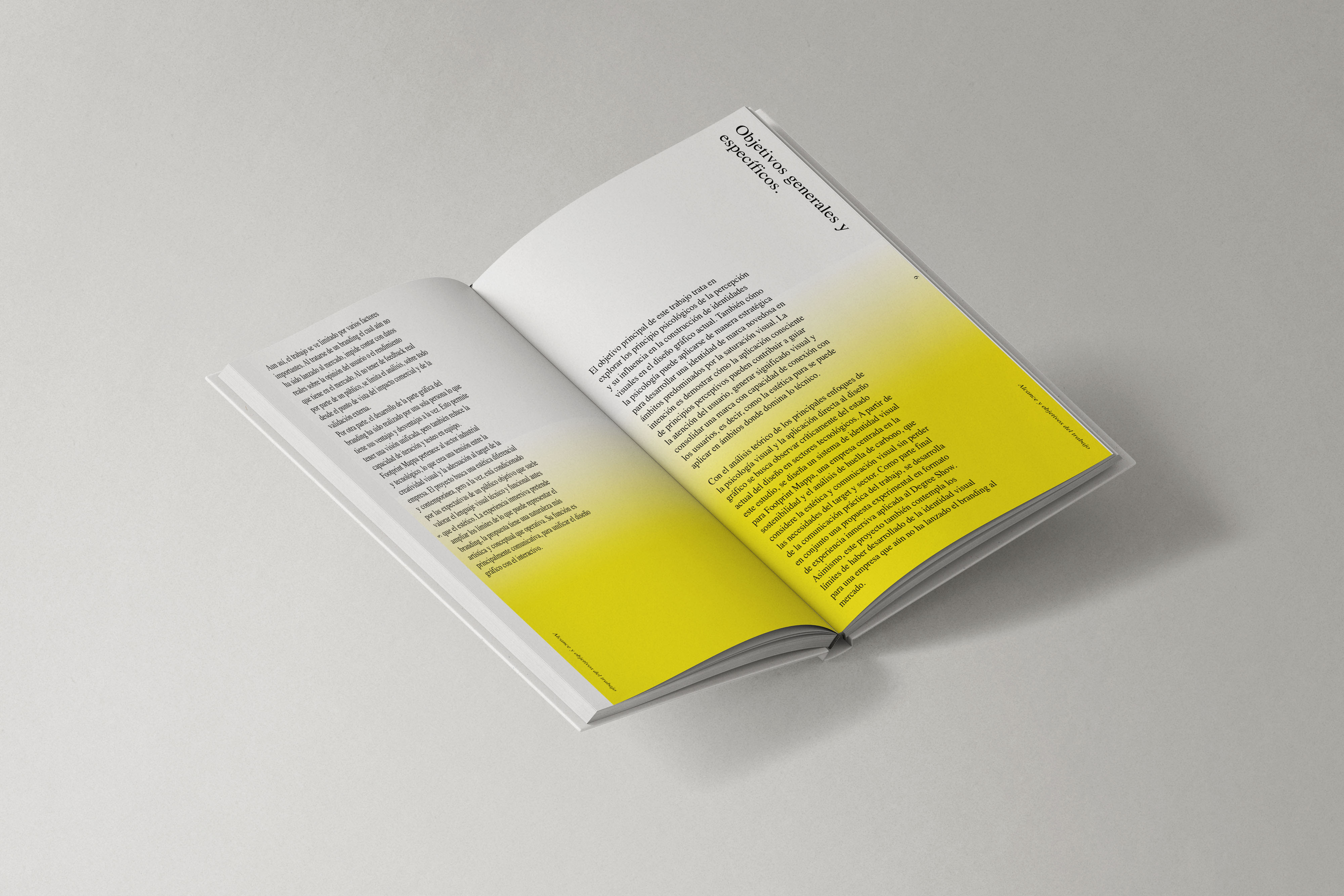 Alongside the branding development for my final degree project, I designed the editorial layout of the book that presented the entire process and outcomes. The goal was to create a publication that not only documented the project but also reflected its visual identity through a clean composition and structure. Each spread was carefully crafted to balance clarity and aesthetics, turning the book itself into an extension of the branding concept—an object that communicates with the same voice and visual language as the project it contains.